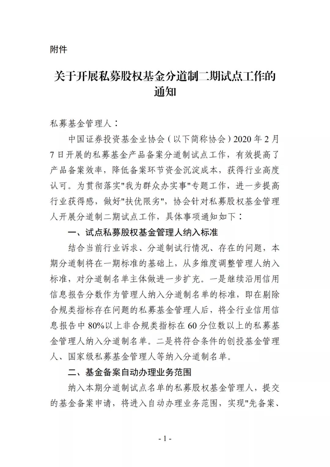 以下為中基協(xié)《關(guān)于開展私募股權(quán)基金分道制二期試點(diǎn)工作的通知》原文: