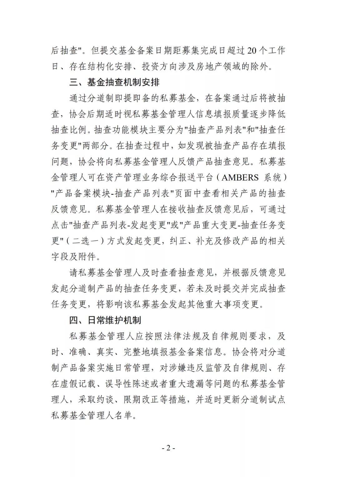 中基協(xié)表示,自2020年2月7日開展的私募基金產(chǎn)品備案分道制試點(diǎn)工作,有效提高了產(chǎn)品備案效率,降低備案環(huán)節(jié)資金沉淀成本,獲得行業(yè)高度認(rèn)可。本次開展分道制二期試點(diǎn)工作,旨在進(jìn)一步提高行業(yè)獲得感,做好“扶優(yōu)限劣”。