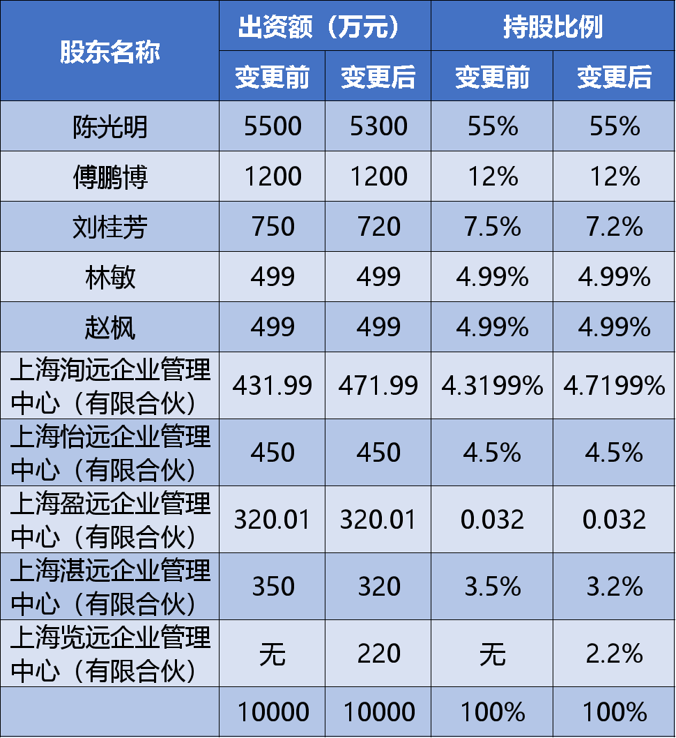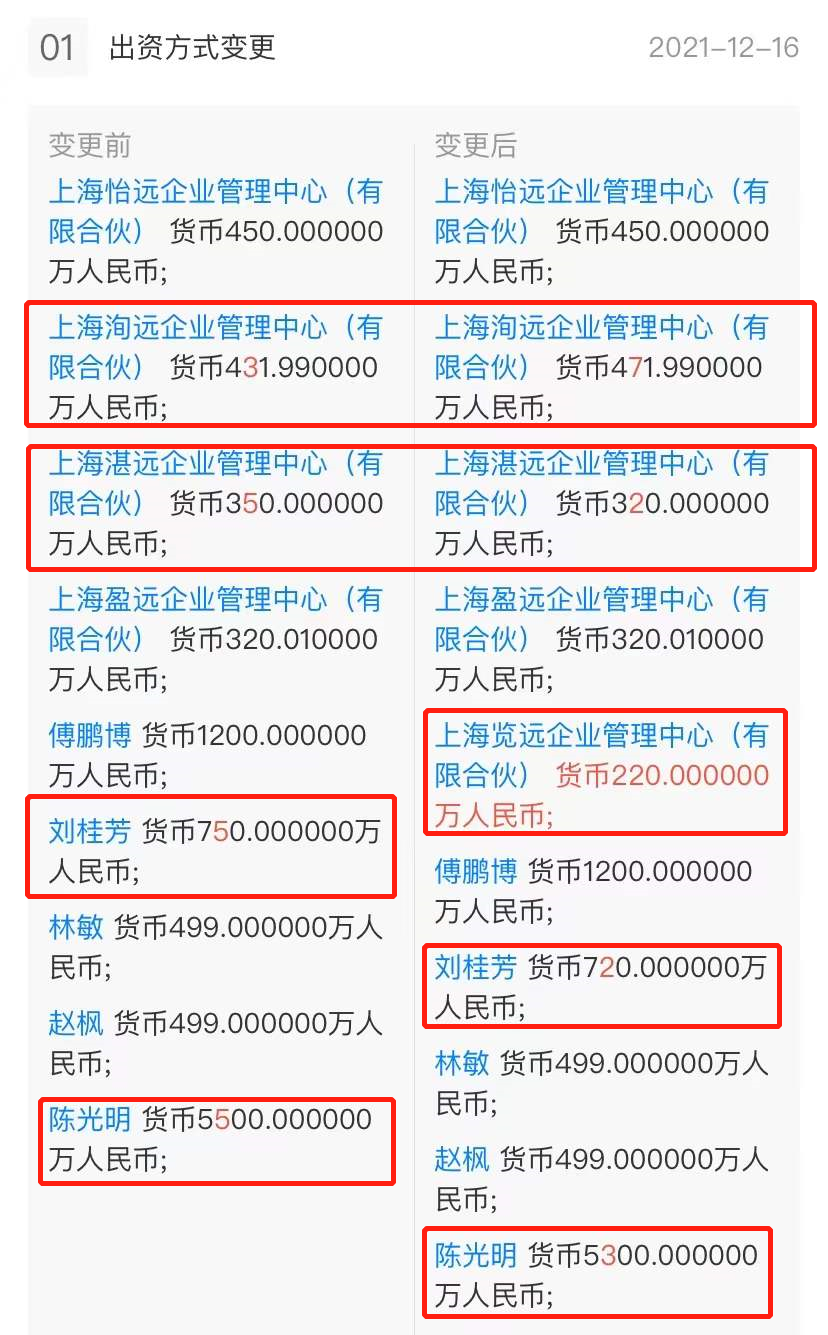 天眼查網(wǎng)站顯示,睿遠(yuǎn)基金在2021年12月16日完成投資人(股權(quán))變更,新增了上海覽遠(yuǎn)企業(yè)管理中心(有限合伙)這一新的員工持股平臺(tái)。與之相對(duì)的是,公司總經(jīng)理陳光明、董事長劉桂芳在內(nèi)的幾個(gè)股東出資額小幅下滑。