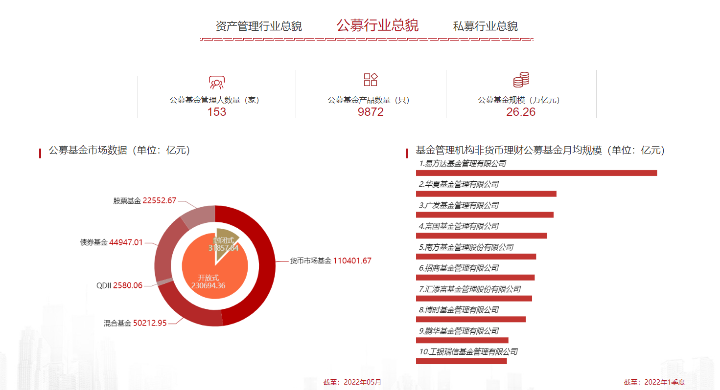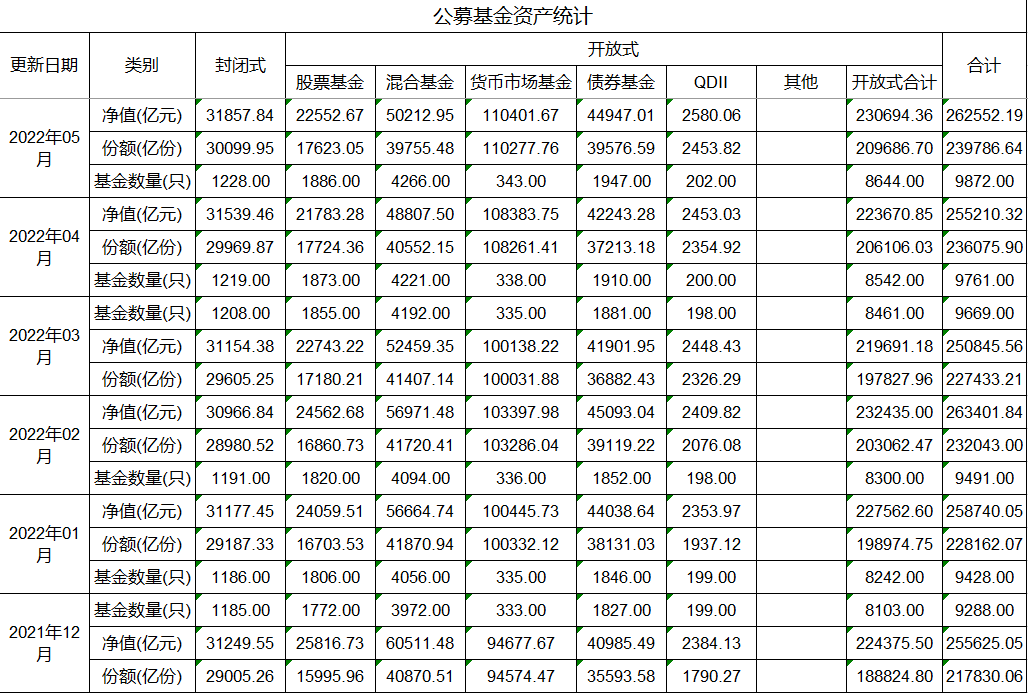 6月29日晚間,中國(guó)證券投資基金業(yè)協(xié)會(huì)(以下簡(jiǎn)稱(chēng)“中基協(xié)”)公布最新的公募基金市場(chǎng)數(shù)據(jù)顯示,截至2022年5月份,我國(guó)境內(nèi)合計(jì)153家公募基金管理人管理了9872只公募基金產(chǎn)品,上述產(chǎn)品資產(chǎn)凈值合計(jì)26.26萬(wàn)億元。