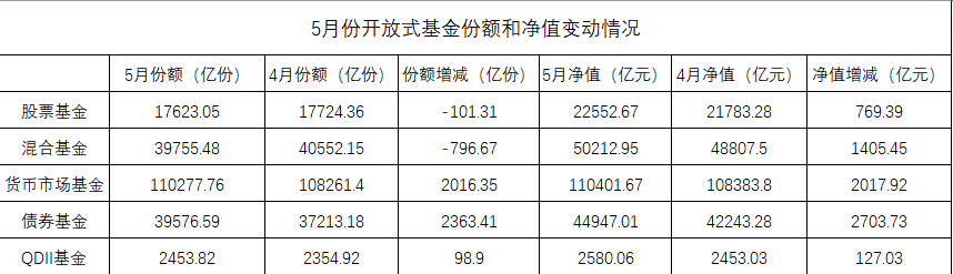 根據(jù)中基協(xié)公布的數(shù)據(jù)顯示,不同類(lèi)型的基金產(chǎn)品,5月份份額和凈值的漲跌差別也較大。