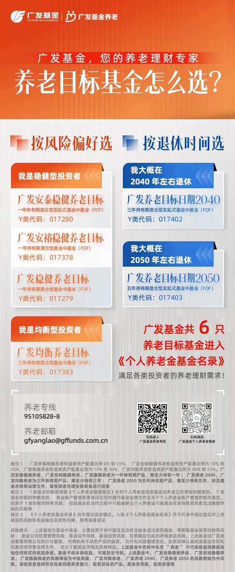 風險提示:上述基金為基金中基金,主要投資于經中國證監(jiān)會依法核準或注冊的基金,將面臨基金投資的特有風險:基金公司經營管理風險、基金運作風險、基金投資風險、巨額贖回引起的凈值波動風險。上述基金由廣發(fā)基金管理有限公司發(fā)行與管理,代銷機構不承擔產品的投資、兌付和風險管理責任。投資前請認真閱讀基金合同和招募說明書等法律文件,充分了解基金詳情及風險特征。上述基金中名稱中包含“養(yǎng)老”不代表收益保障或其他任何形式的收益承諾?;鸩槐1颈J找?,可能發(fā)生虧損。上述基金中,廣發(fā)安泰穩(wěn)健養(yǎng)老、廣發(fā)安裕穩(wěn)健養(yǎng)老、廣發(fā)穩(wěn)健養(yǎng)老的風險等級為中低風險,廣發(fā)均衡養(yǎng)老、廣發(fā)養(yǎng)老2040、廣發(fā)養(yǎng)老2050的風險等級為中風險,請投資者選擇符合自身風險承受能力、投資目標的產品?;鹩酗L險,投資須謹慎。