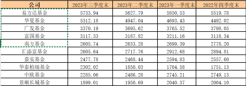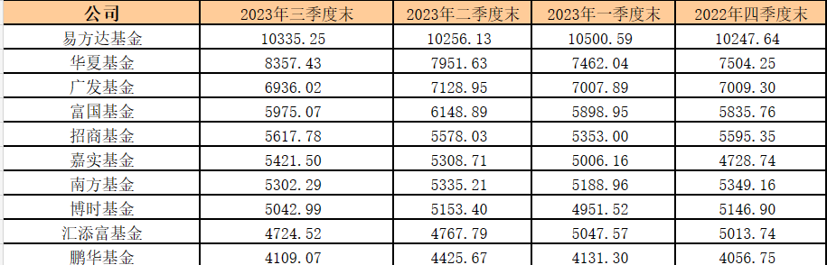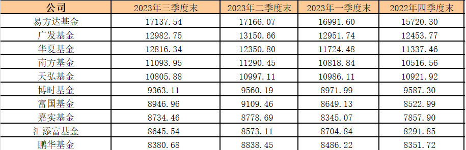 三季度前十大公募管理人總管理規(guī)模,單位:億元,數(shù)據(jù)來源:天相投顧