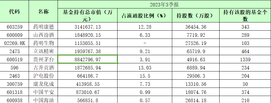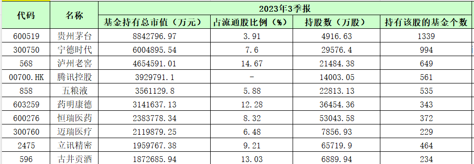 三季度基金前十大重倉(cāng)股 數(shù)據(jù)來源:天相投顧