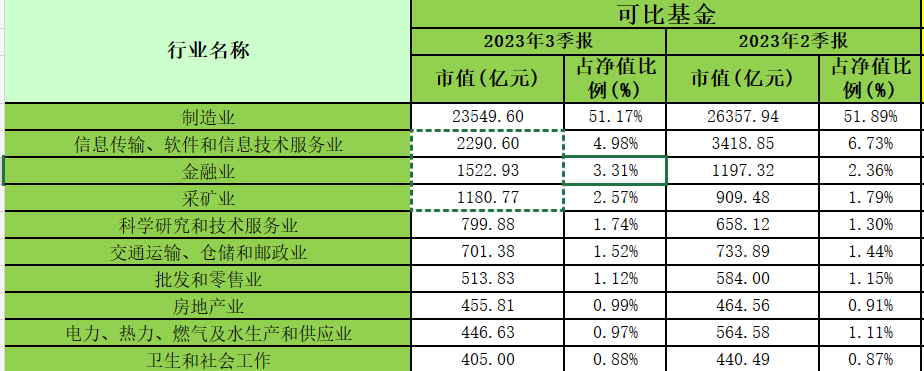 相較二季度,三季度公募基金依然對(duì)制造業(yè)、信息傳輸、金融業(yè)和采礦業(yè)等板塊持續(xù)青睞。天相投顧數(shù)據(jù)顯示,三季度公募在制造業(yè)板塊的持有市值高達(dá)2.3萬億元,在信息技術(shù)、金融業(yè)和采礦業(yè)的持有市值分別為2290.60億元、1522.93億元、1180.77億元。