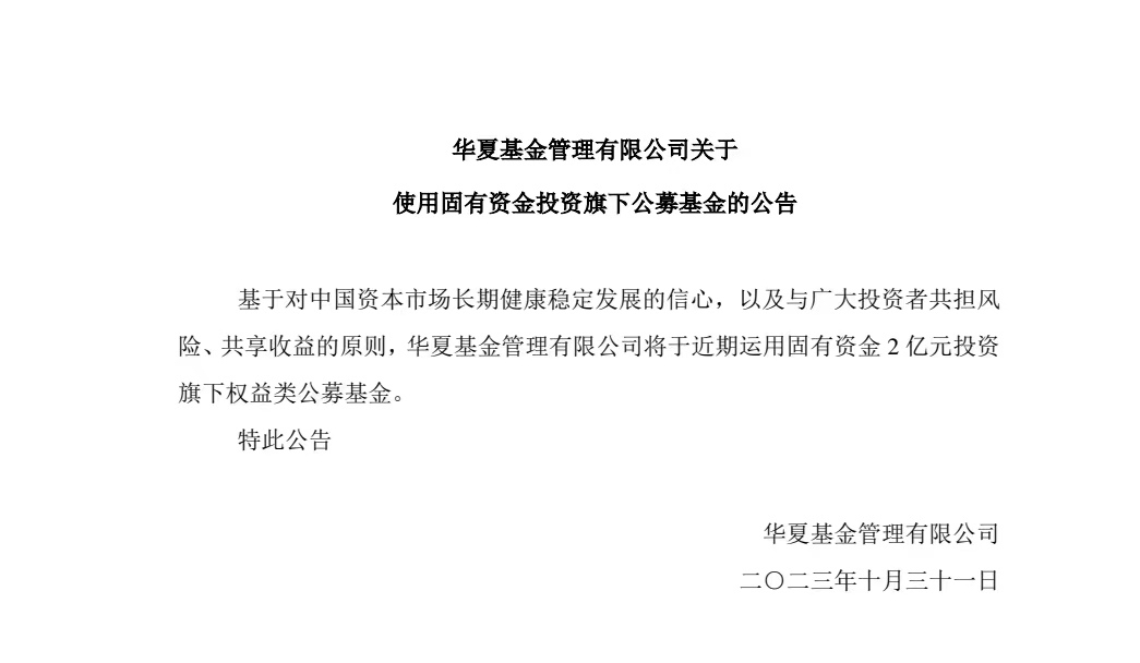 10月31日,華夏基金公告稱基于對中國資本市場長期健康穩(wěn)定發(fā)展的信心,以及與廣大投資者共擔風險、共享收益的原則,華夏基金管理有限公司將于近期運用固有資金2億元投資旗下權(quán)益類公募基金。