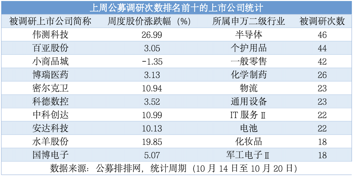 偉測科技上周被調(diào)研46次居首,是一家獨(dú)立第三方集成電路測試服務(wù)企業(yè),主營業(yè)務(wù)包括晶圓測試、芯片成品測試以及與集成電路測試相關(guān)的配套服務(wù)。百亞股份和小商品城分別被調(diào)研44次和42次緊隨其后。此外,上周獲調(diào)研次數(shù)前十的公司還包括博瑞醫(yī)藥、密爾克衛(wèi)、科德數(shù)控、中科創(chuàng)達(dá)、安達(dá)科技、水羊股份、國博電子等7家上市公司,被調(diào)研次數(shù)均不少于18次。