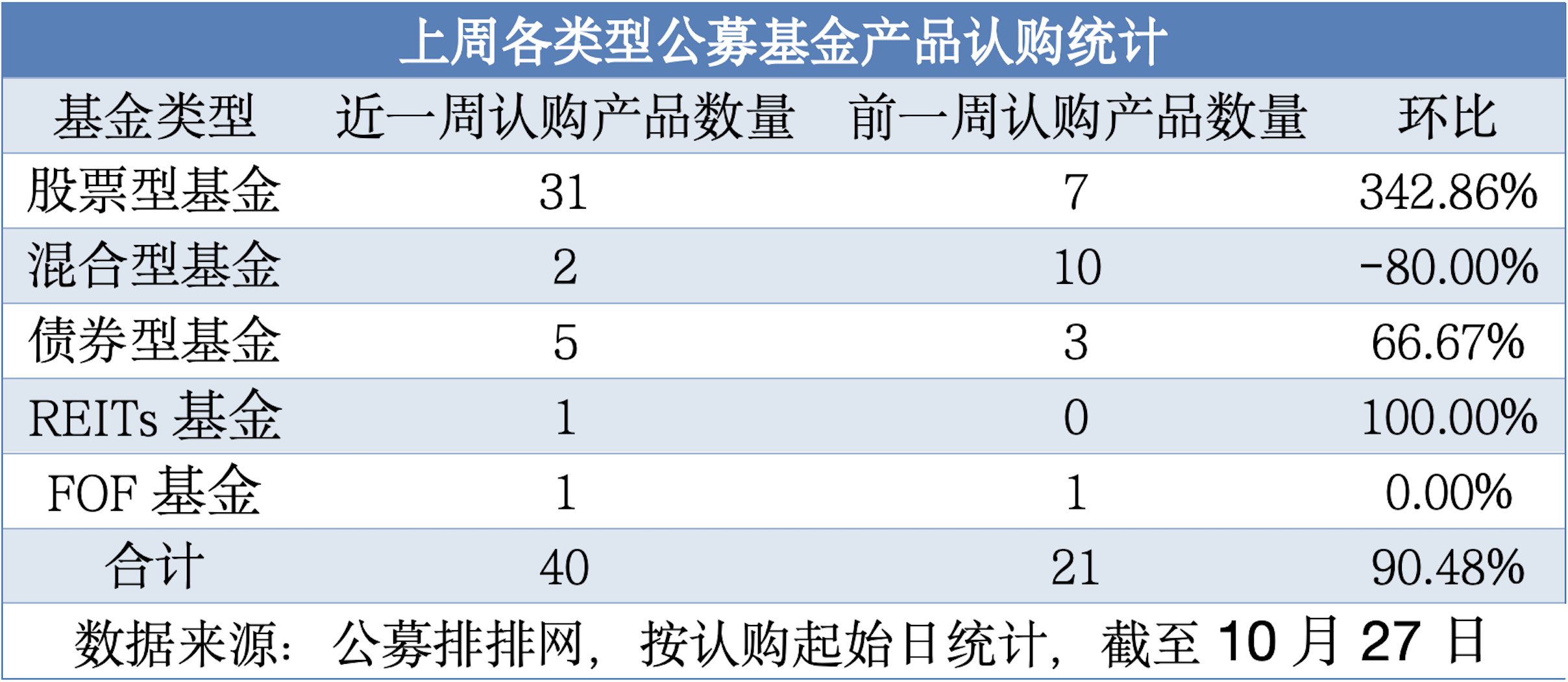 公募排排網(wǎng)數(shù)據(jù)顯示,截至10月27日,按基金認購起始日統(tǒng)計,近一周共有40只基金開啟認購,較前一周的21只相比,環(huán)比大幅增長90.48%。