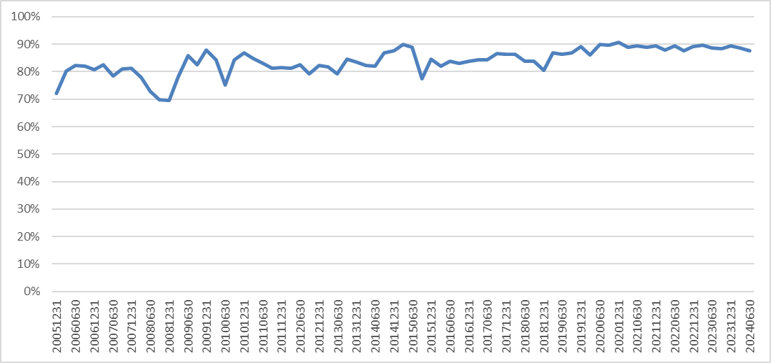 我們統(tǒng)計全市場主動權(quán)益基金的持股倉位變動情況,可以看到公募基金的持股行為,在過去20年維持在70%至90%的高倉位水平運作,是典型的長期資金行為模式。