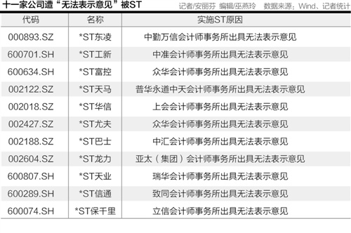 除了*ST烯碳,今年以來(lái)已有11家上市公司因?yàn)楸怀鼍叻菢?biāo)意見(jiàn)而被ST處理。