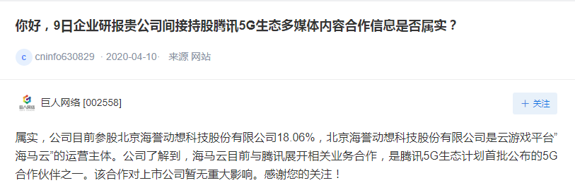 4月30日,巨人網(wǎng)絡(luò)在互動易上回復投資者關(guān)于是否間接持股騰訊5G生態(tài)合作伙伴海馬云,稱屬實。目前巨人持有北京海譽動想科技股份有限公司(簡稱“北京海譽動想”)18.06%的股份,海馬云是后者旗下產(chǎn)品。