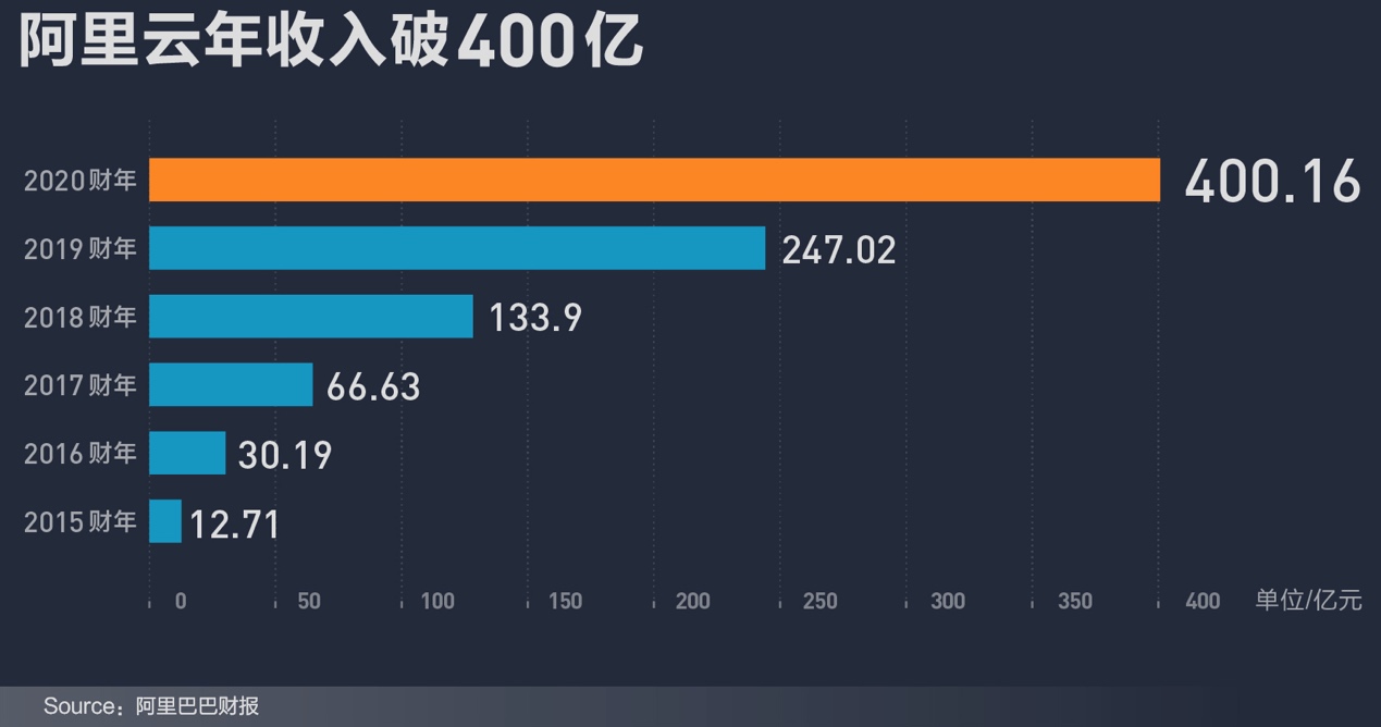 2020財年第四季度內(nèi),阿里云營收達(dá)122億元,環(huán)比大幅增長,單季度收入連續(xù)第二個季度突破百億元大關(guān)。對比歷史數(shù)據(jù),2015財年阿里巴巴首次披露云計算營收,當(dāng)年阿里云收入為12.71億元,到2020財年營收400億元,6年間增長了31倍。