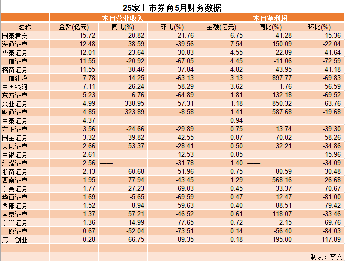 上市券商5月份財(cái)務(wù)數(shù)據(jù)今日密集披露,截至記者發(fā)稿,目前已有25家券商披露月報(bào),合計(jì)實(shí)現(xiàn)營收125億元(母子合并數(shù)據(jù),下同),實(shí)現(xiàn)凈利潤49.2億元。環(huán)比4月份,目前僅有1家券商實(shí)現(xiàn)凈利潤增長,而營收方面則出現(xiàn)全面下滑。