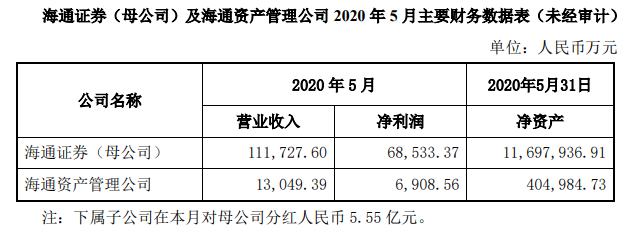 目前來看,海通證券5月份凈利潤領(lǐng)先,為7.54億元。海通證券月報(bào)顯示,下屬子公司在5月份對(duì)母公司分紅5.55億元。