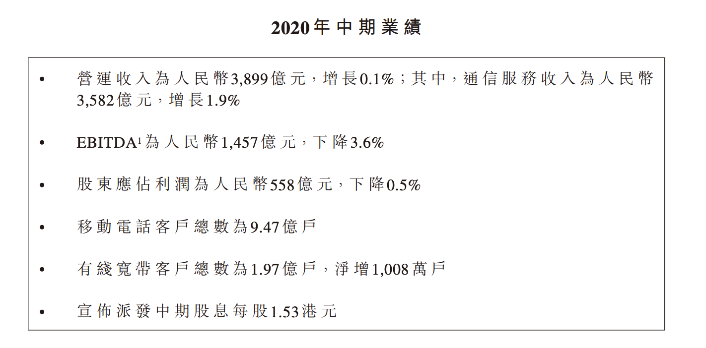 8月13日午間,中國(guó)移動(dòng)發(fā)布2020年中期業(yè)績(jī)報(bào)告顯示,上半年公司營(yíng)收為3899億元,同比增長(zhǎng)0.1%。其中,通信服務(wù)收入達(dá)到3582億元,同比增長(zhǎng)1.9%。