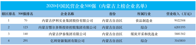 近日,中華全國(guó)工商業(yè)聯(lián)合會(huì)發(fā)布“2020中國(guó)民營(yíng)企業(yè)500強(qiáng)”“中國(guó)民營(yíng)企業(yè)制造業(yè)500強(qiáng)”“中國(guó)民營(yíng)企業(yè)服務(wù)業(yè)100強(qiáng)”榜單。內(nèi)蒙古有4家企業(yè)進(jìn)入“2020中國(guó)民營(yíng)企業(yè)500強(qiáng)”行列,與上一年度持平;有5家企業(yè)入圍“2020中國(guó)民營(yíng)企業(yè)制造業(yè)500強(qiáng)”。