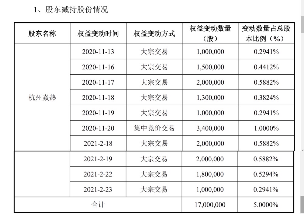 根據(jù)《簡式權(quán)益變動報(bào)告書》顯示,本次權(quán)益變動前,杭州焱熱持有冀凱股份股票3740萬股,占公司總股本的11.00%;本次權(quán)益變動后(截止到2月23日),杭州焱熱持有冀凱股份股票2040萬股,占公司總股本的6.00%。
