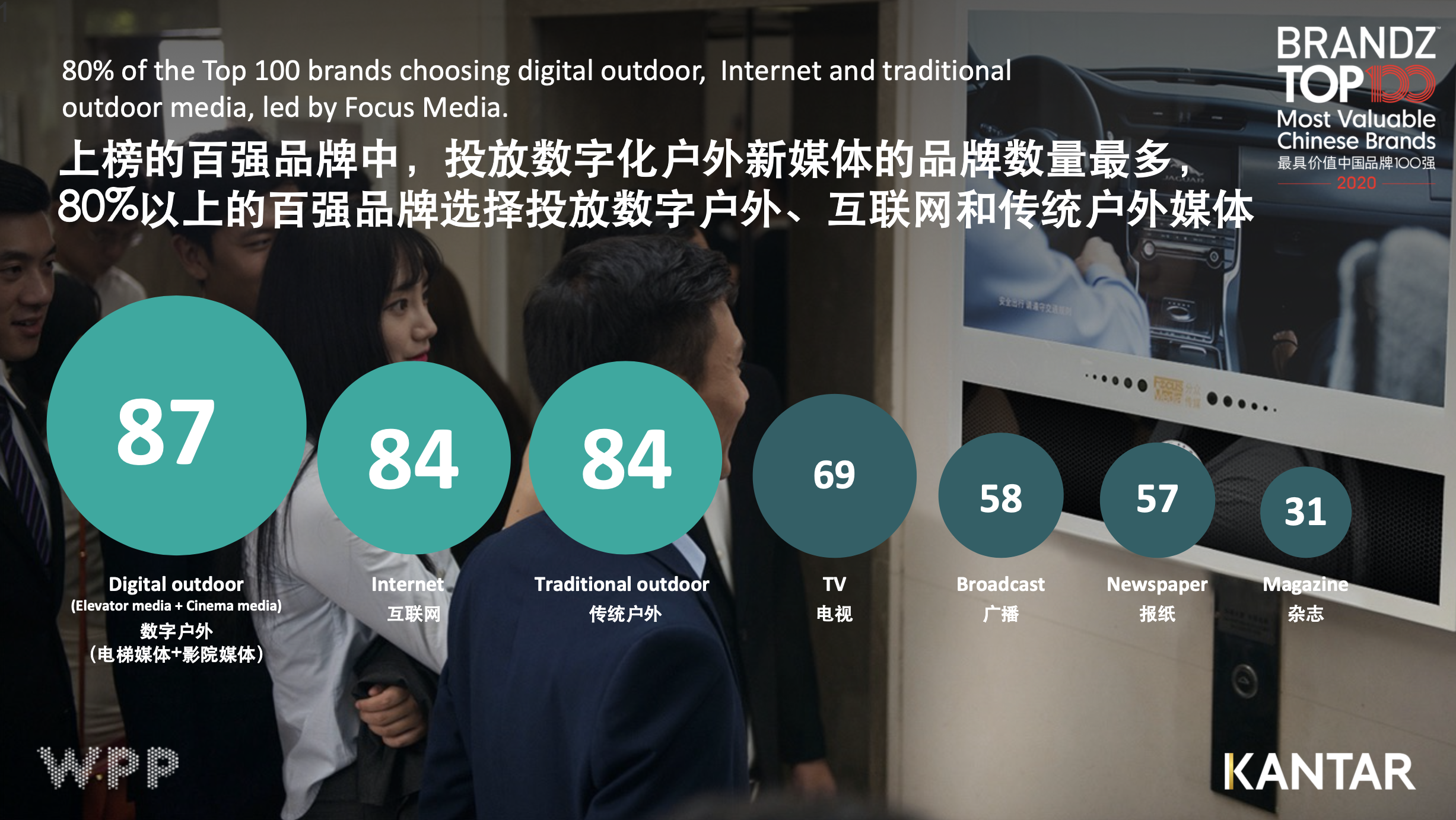 分眾長期穩(wěn)固的受眾注意力價值與品牌引爆能力正獲得更廣泛客戶的青睞。在WPP與凱度共同發(fā)布的2020年“BrandZ™最具價值中國品牌100強”榜單中,投放分眾為代表的數(shù)字化戶外新媒體的品牌數(shù)量占87%。