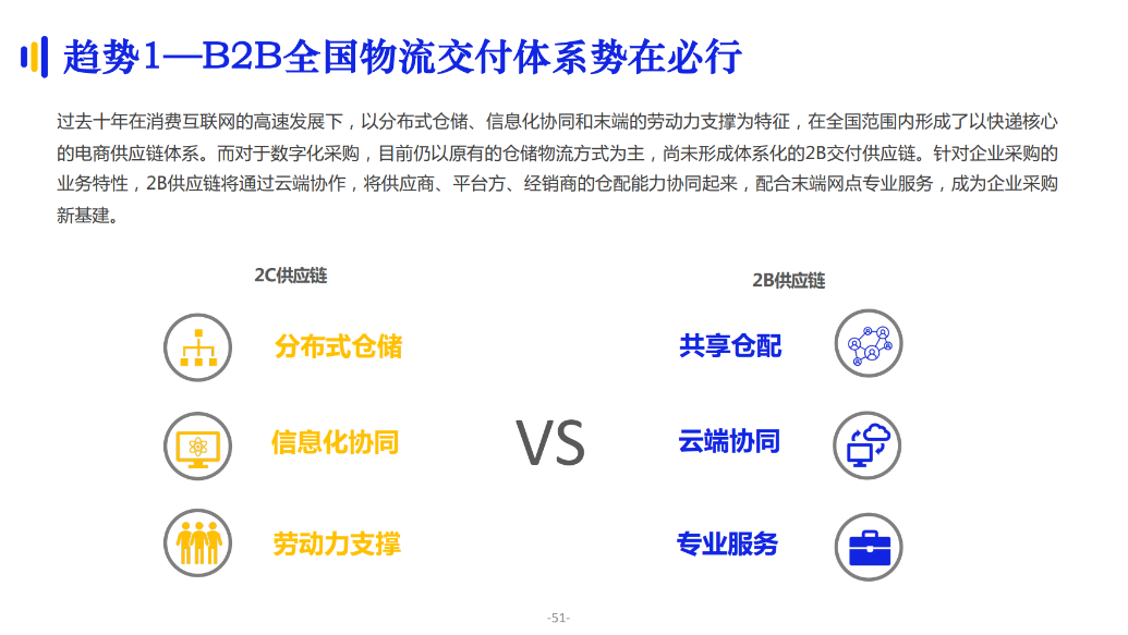 數(shù)字化采購從政府機(jī)構(gòu)、央國企、金融機(jī)構(gòu)的陽光化采購開始起步,當(dāng)前正逐步向大型企業(yè)、地方國企滲透。其中,大型政企客戶對采購服務(wù)商的全國性交付網(wǎng)絡(luò)和本地服務(wù)體系十分重視。億邦智庫在報告中提出,數(shù)字化采購市場發(fā)展趨勢下,B2B全國物流交付體系勢在必行。行業(yè)中許多領(lǐng)軍型企業(yè)已經(jīng)在布局全國的物流交付體系,這對整個數(shù)字化采購市場的繁榮將起到巨大促進(jìn)作用。報告也指出,數(shù)字化采購將推動形成體系化的B2B交付供應(yīng)鏈,并將供應(yīng)商、平臺方、經(jīng)銷商的倉配能力協(xié)同起來,配合末端網(wǎng)點專業(yè)服務(wù),成為企業(yè)采購的新基建。