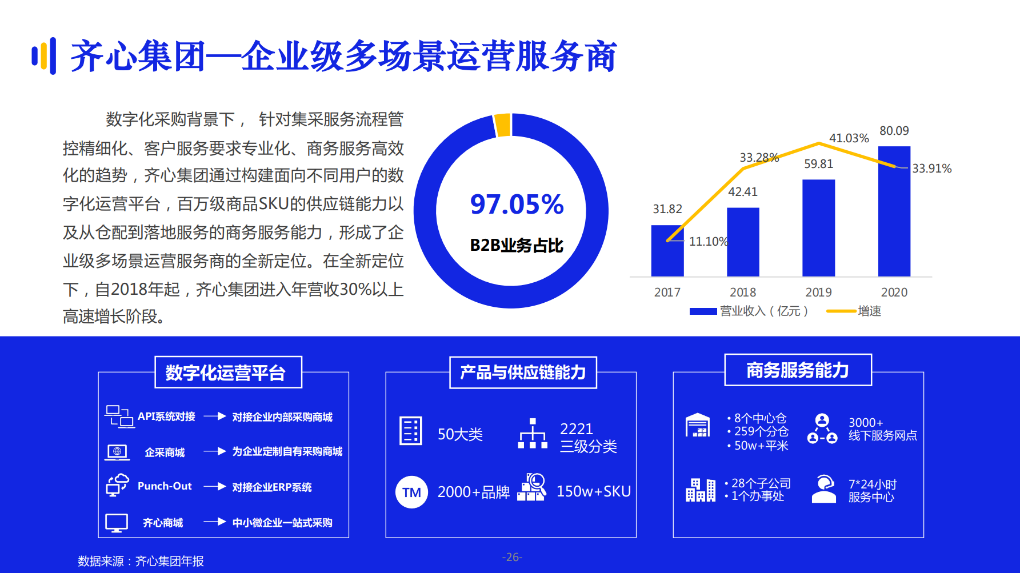 致力于成為“企業(yè)級多場景運營服務(wù)商”的齊心集團(tuán),近年迎來高速增長階段。對比同行業(yè)企業(yè),齊心集團(tuán)在數(shù)字化運營平臺、產(chǎn)品與供應(yīng)鏈能力、商務(wù)服務(wù)能力三方面樹立了較強的競爭優(yōu)勢,在辦公集采領(lǐng)域持續(xù)開拓政企大客戶,新增黨政機(jī)關(guān)、航空航天、能源電力、工程建筑、金融通訊等行業(yè)大客戶,并深挖原有客戶業(yè)務(wù)訂單需求。同時,齊心集團(tuán)也在MRO工業(yè)品、企業(yè)福利品業(yè)務(wù)方面持續(xù)深耕強化品類優(yōu)勢,為B2B業(yè)務(wù)打造新的增長極。據(jù)齊心集團(tuán)年報顯示,自2018年起,其年營收保持增長30%以上。