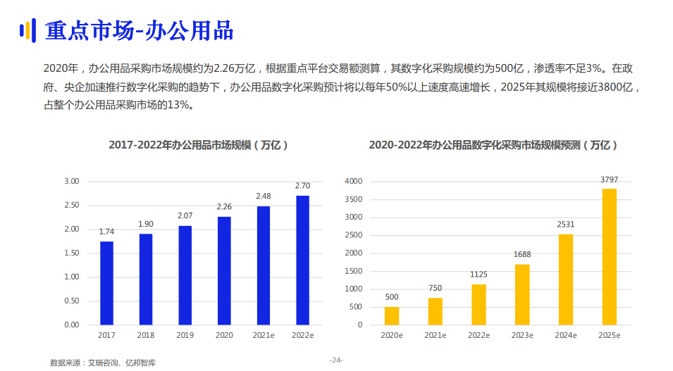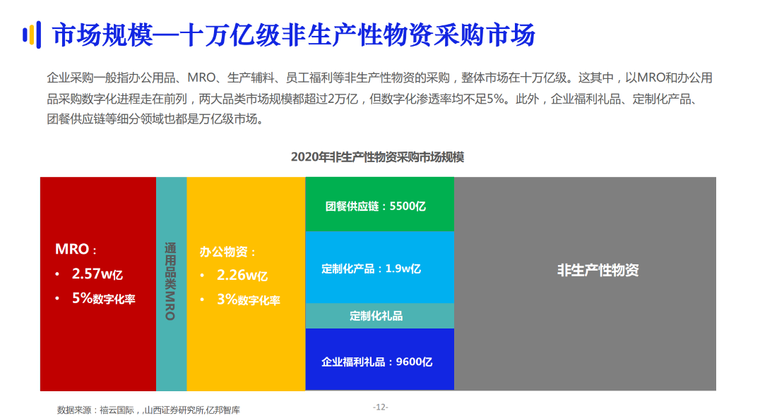 5月26日,專注于電子商務(wù)產(chǎn)業(yè)研究的億邦智庫正式發(fā)布了《2021中國數(shù)字化采購發(fā)展報告》(以下簡稱“報告”)。報告顯示,2021年數(shù)字化采購市場正式進(jìn)入成長期,其中以MRO工業(yè)品和辦公用品采購數(shù)字化進(jìn)程走在前列,兩大品類市場規(guī)模都超過2萬億。報告預(yù)測,在十萬億級、數(shù)字化滲透率不足5%的采購市場內(nèi),將有希望誕生一批營收過千億、市值過千億的雙千億平臺。