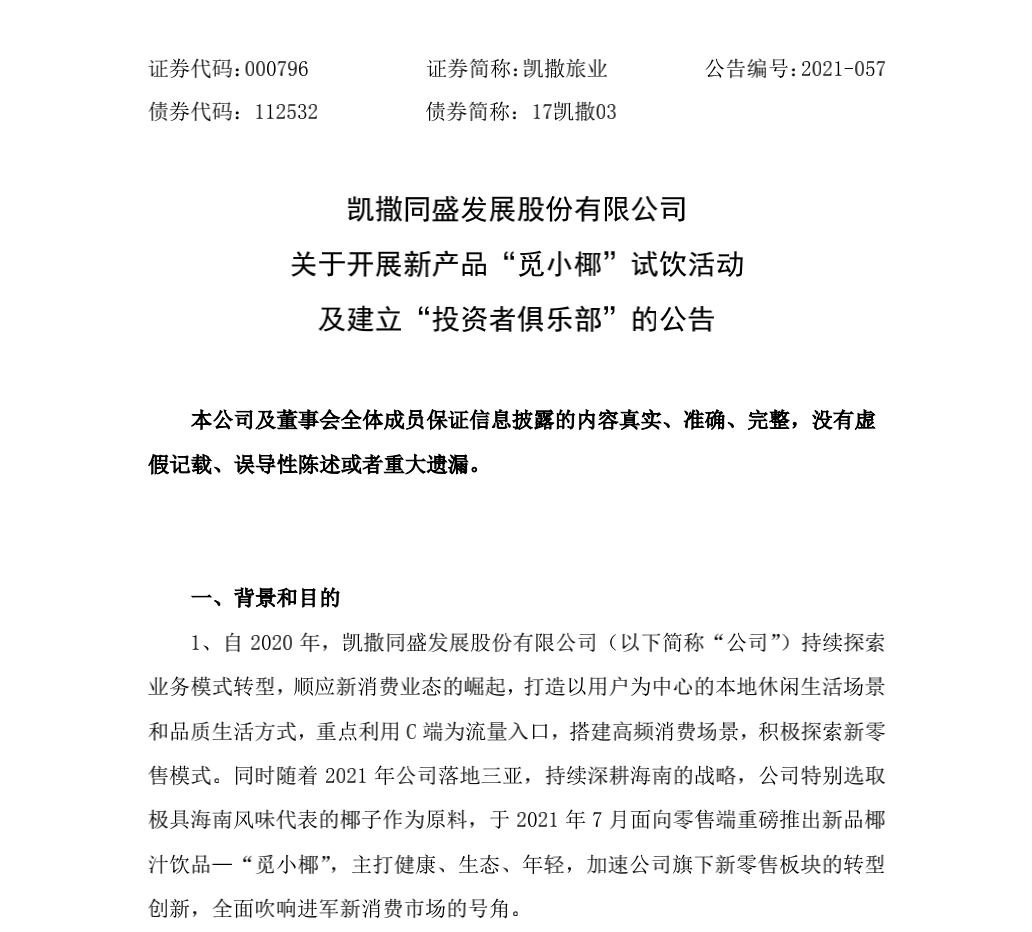 8月18日晚間,凱撒同盛發(fā)展股份有限公司(以下簡稱:凱撒旅業(yè),000796.SZ)發(fā)布公告稱,公司近期在社群經(jīng)濟(jì)生態(tài)平臺鐺鐺社交APP上建立了“凱撒旅業(yè)投資者俱樂部”公眾圈,加強(qiáng)與投資者之間的溝通,同時(shí)向全體股東開展椰汁飲品“覓小椰”試飲活動。