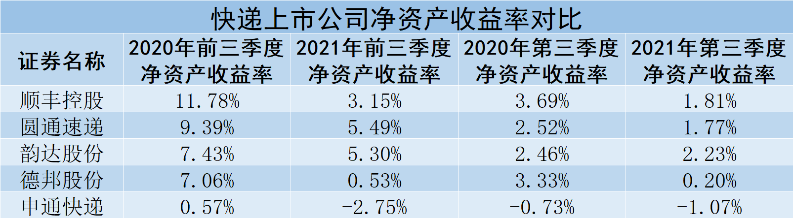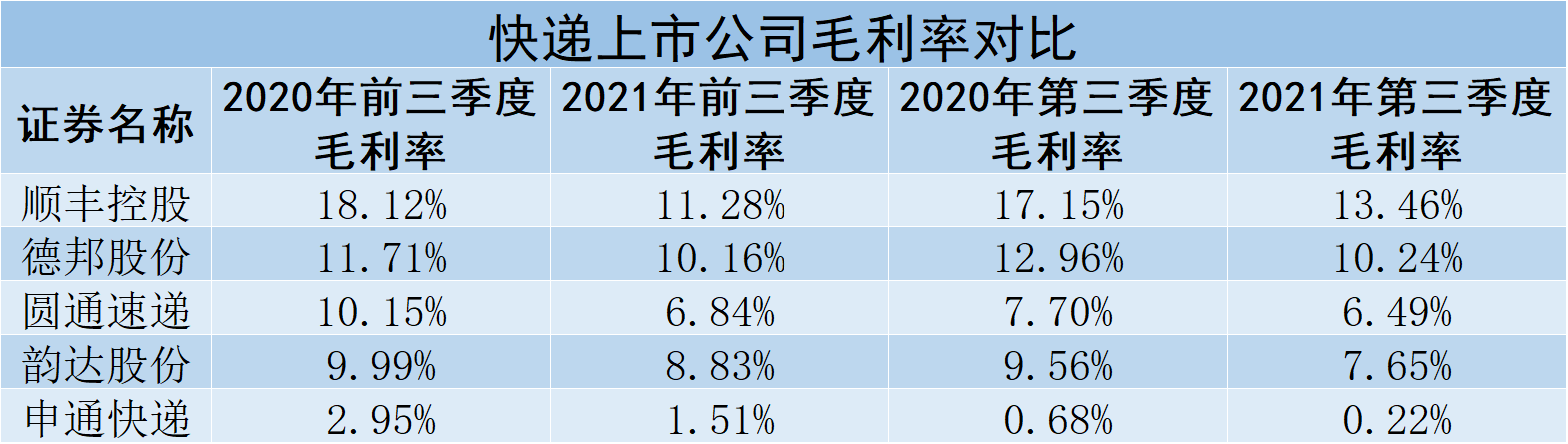 從2021年前三季度快遞上市公司業(yè)績來看,5家公司前三季度營業(yè)收入均實現(xiàn)不同程度增長,平均增幅為22.45%。然而在實現(xiàn)歸母凈利潤方面,5家公司都呈現(xiàn)不同程度的下滑;剔除前三季度歸母凈利潤虧損的申通快遞,其余4家公司歸母凈利潤同比平均下降53.26%。