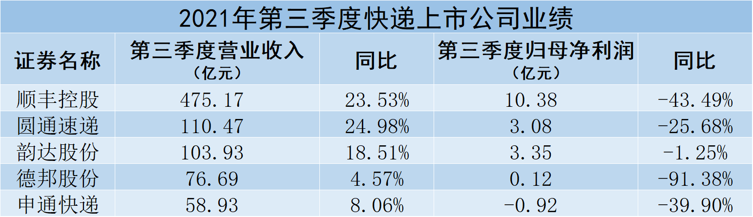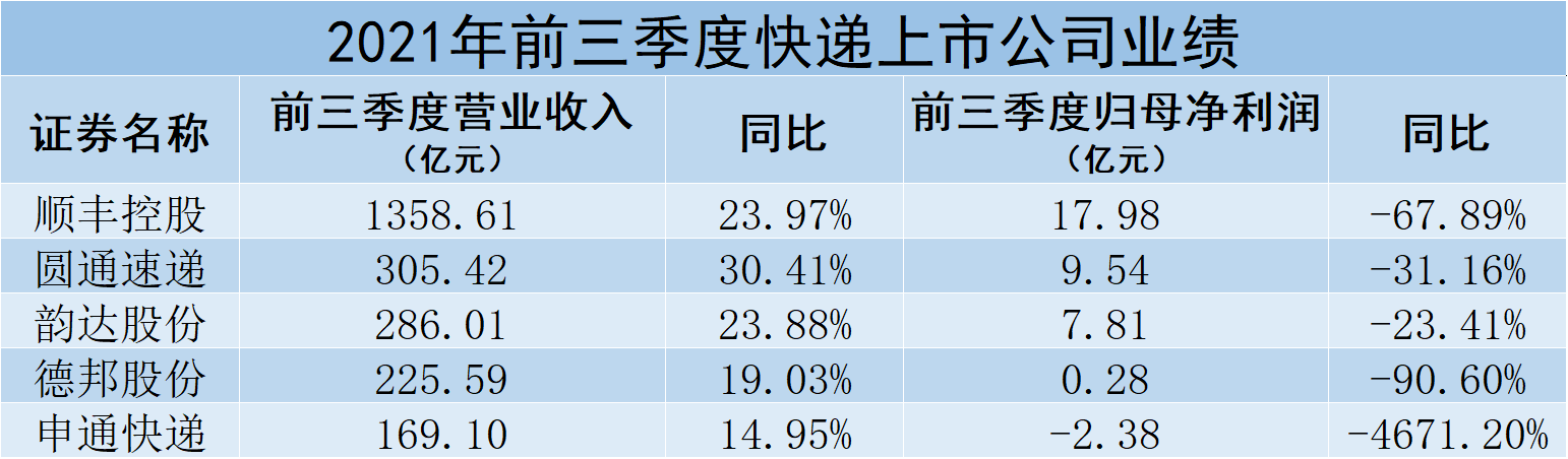 隨著三季報披露結(jié)束,順豐控股、圓通速遞、韻達股份、申通快遞和德邦股份5家A股快遞上市公司延續(xù)半年報行情,業(yè)績整體呈現(xiàn)出增收不增利的態(tài)勢。順豐控股前三季度和第三季度分別實現(xiàn)營業(yè)收入1358.61億元和475.17億元,快遞公司龍頭地位難以撼動;圓通速遞前三季度和第三季度營業(yè)收入增幅最高,增幅分別為30.41%和24.98%。