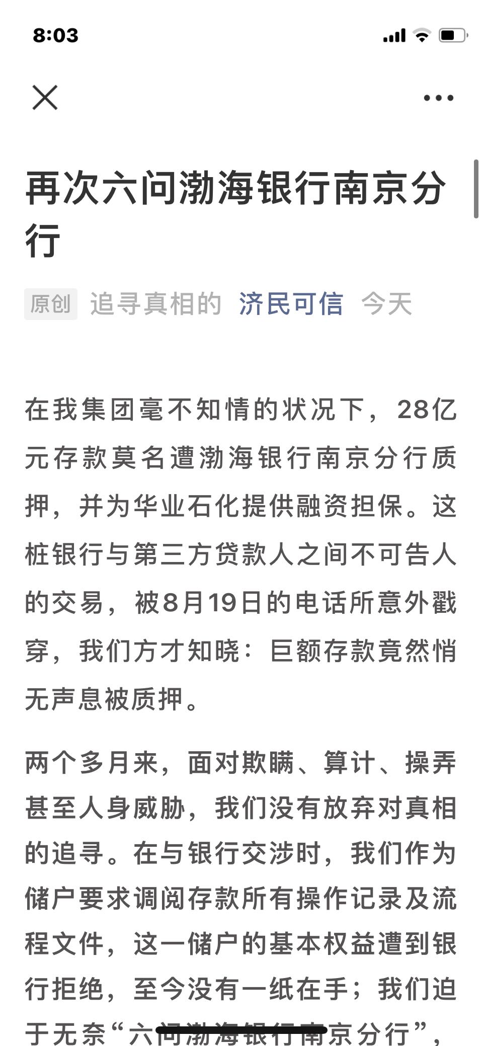 上述推文還說(shuō),“案發(fā)后的8月21日,渤海銀行南京分行營(yíng)業(yè)部總經(jīng)理胡兆鋒、總經(jīng)理助理管鵬程,帶領(lǐng)華業(yè)石化相關(guān)人員首次與濟(jì)民可信一方見(jiàn)面,承認(rèn)將濟(jì)民可信的存款用于貸款質(zhì)押,講述了相關(guān)過(guò)程和細(xì)節(jié),并拋出了一個(gè)再次質(zhì)押的解決方案,被濟(jì)民可信當(dāng)場(chǎng)拒絕。到了8月25日晚,貴行強(qiáng)行劃扣我方5億元存款后,華業(yè)石化資金部總監(jiān)董蕓又單獨(dú)找到我們,講述劃扣前如何與貴行鄭順寧副行長(zhǎng)等領(lǐng)導(dǎo)溝通的細(xì)節(jié)。對(duì)此我們深為震驚:貴行除管鵬程等人與華業(yè)石化勾肩搭背,其他管理層人員是否也參與了將我集團(tuán)28億元存款質(zhì)押的全過(guò)程?”