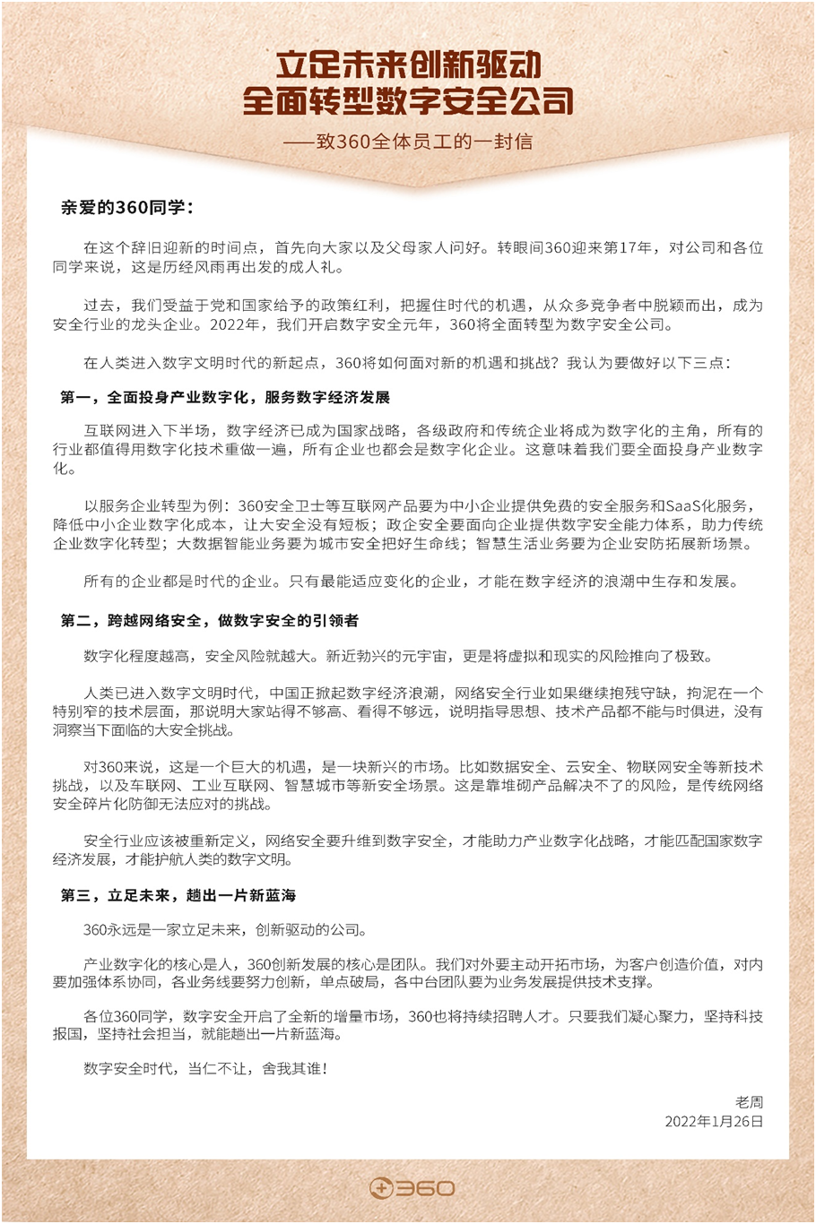 1月26日,360集團(tuán)創(chuàng)始人周鴻祎發(fā)出內(nèi)部全員信,宣布360全面轉(zhuǎn)型數(shù)字安全公司。2022年數(shù)字安全元年到來(lái),同時(shí)開(kāi)啟了全新增量市場(chǎng),周鴻祎稱360將持續(xù)招聘人才。