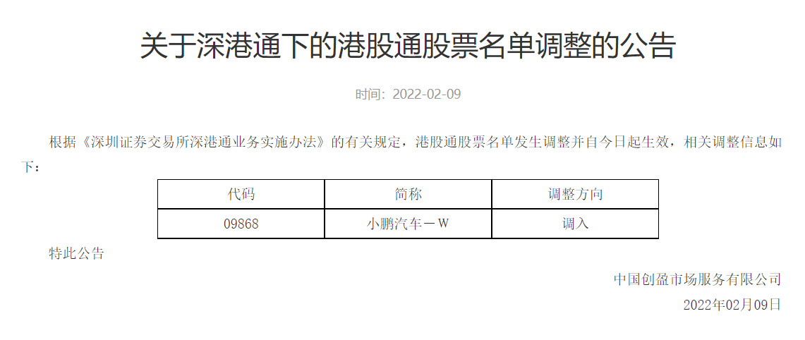 2月9日,深交所發(fā)布公告稱,根據《深圳證券交易所深港通業(yè)務實施辦法》的有關規(guī)定,將小鵬汽車(9868.HK)納入深港通下的港股通股票名單,自2月9日起正式生效。受此利好消息提振,9日收盤,小鵬汽車報收152.50港元,漲幅達8%。2月10日,小鵬汽車繼續(xù)上漲3.08%,最新市值2692億港元。