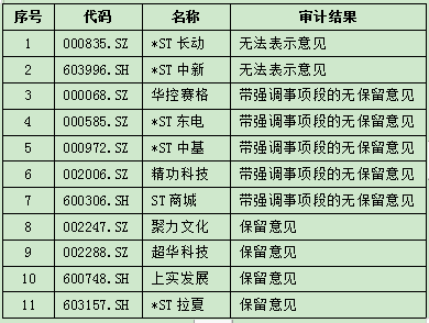 在這11家被非標(biāo)的上市公司中,有一些公司只是某些會計科目或細(xì)節(jié)被審計機(jī)構(gòu)重點標(biāo)注并提示風(fēng)險,但也有一些上市公司的狀況,讓審計機(jī)構(gòu)直接“無語”。