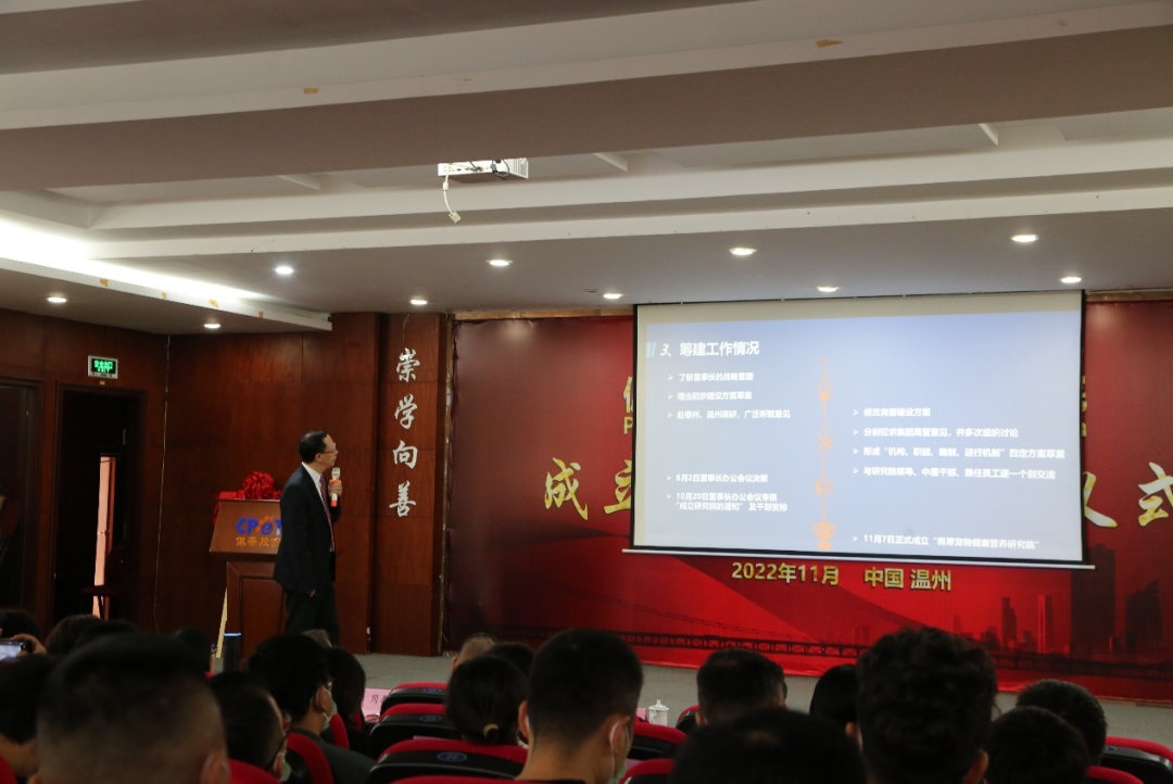 成立大會還邀請了平陽縣科技局局長白榮濤和水頭鎮(zhèn)黨委書記周春珍,一起見證了佩蒂寵物健康營養(yǎng)研究院的成立。