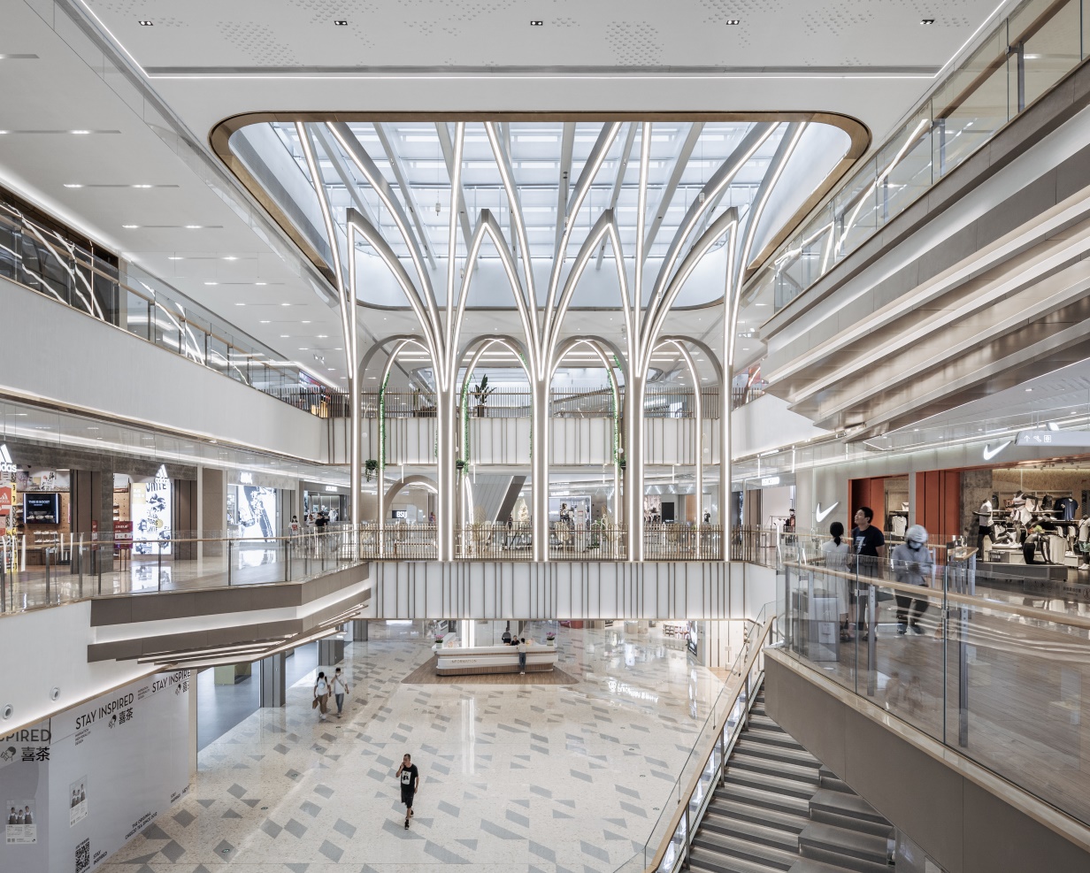廈門集美世茂廣場中庭大面積天窗,保證室內(nèi)充足光線;同時通過設(shè)置內(nèi)遮陽及彩釉點,又有效保證了中庭溫度適宜,極大地減少了商場的能耗,注入環(huán)保設(shè)計理念。