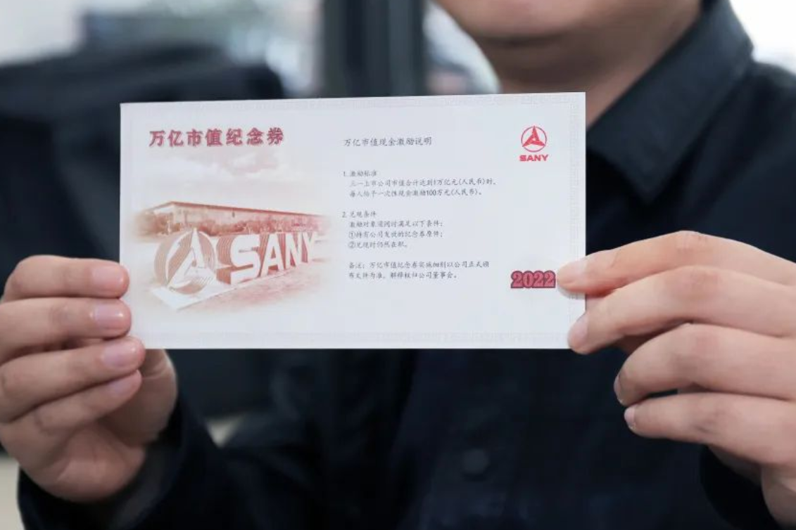 4月3日,三一集團(tuán)官方微信公眾號(hào)宣布,575張制作精美的“萬(wàn)億市值紀(jì)念券”經(jīng)三一集團(tuán)人力資源總部統(tǒng)一發(fā)放到三一集團(tuán)各關(guān)鍵員工手中。未來(lái)當(dāng)三一集團(tuán)旗下上市公司總市值超過(guò)1萬(wàn)億元時(shí),這張獎(jiǎng)券可兌換100萬(wàn)元獎(jiǎng)金。