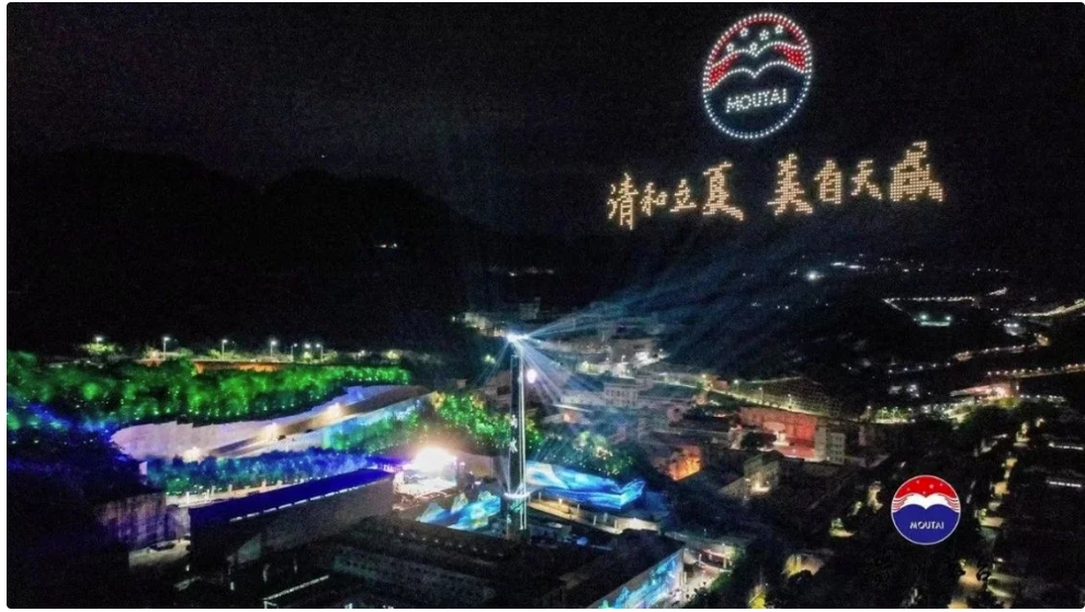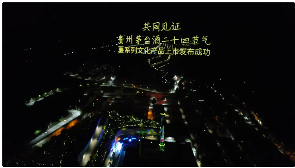 多架無(wú)人機(jī)以夜空為幕,在美輪美奐的燈光色彩配合下,小巽、茅臺(tái)酒瓶等造型和“共同見證貴州茅臺(tái)酒二十四節(jié)氣夏系列文化產(chǎn)品上市發(fā)布成功”等字樣依次呈現(xiàn),為與會(huì)人員獻(xiàn)上了一場(chǎng)精彩的視覺盛宴,更展示了茅臺(tái)品牌和文化的極致魅力。