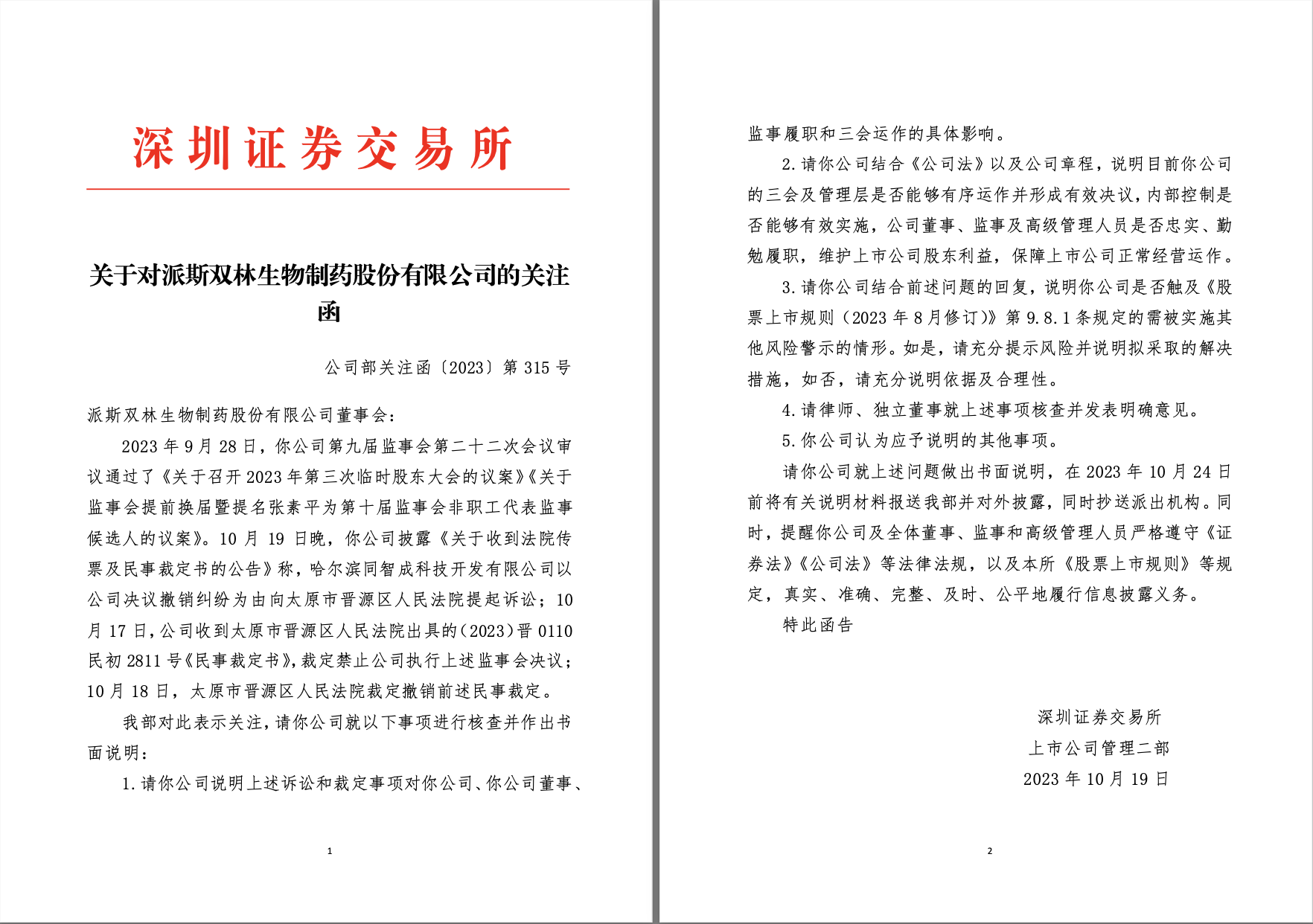 就在派林生物發(fā)布收到法院傳票及民事裁定書的公告當(dāng)晚,深交所火速向派林生物發(fā)布關(guān)注函,要求公司說明三會及管理層是否能夠有序運作并形成有效決議,內(nèi)部控制是否能夠有效實施,公司董事、監(jiān)事及高級管理人員是否忠實、勤勉履職,維護上市公司股東利益,保障上市公司正常經(jīng)營運作;同時還要求公司說明是否觸及相關(guān)規(guī)定的需被實施其他風(fēng)險警示的情形。