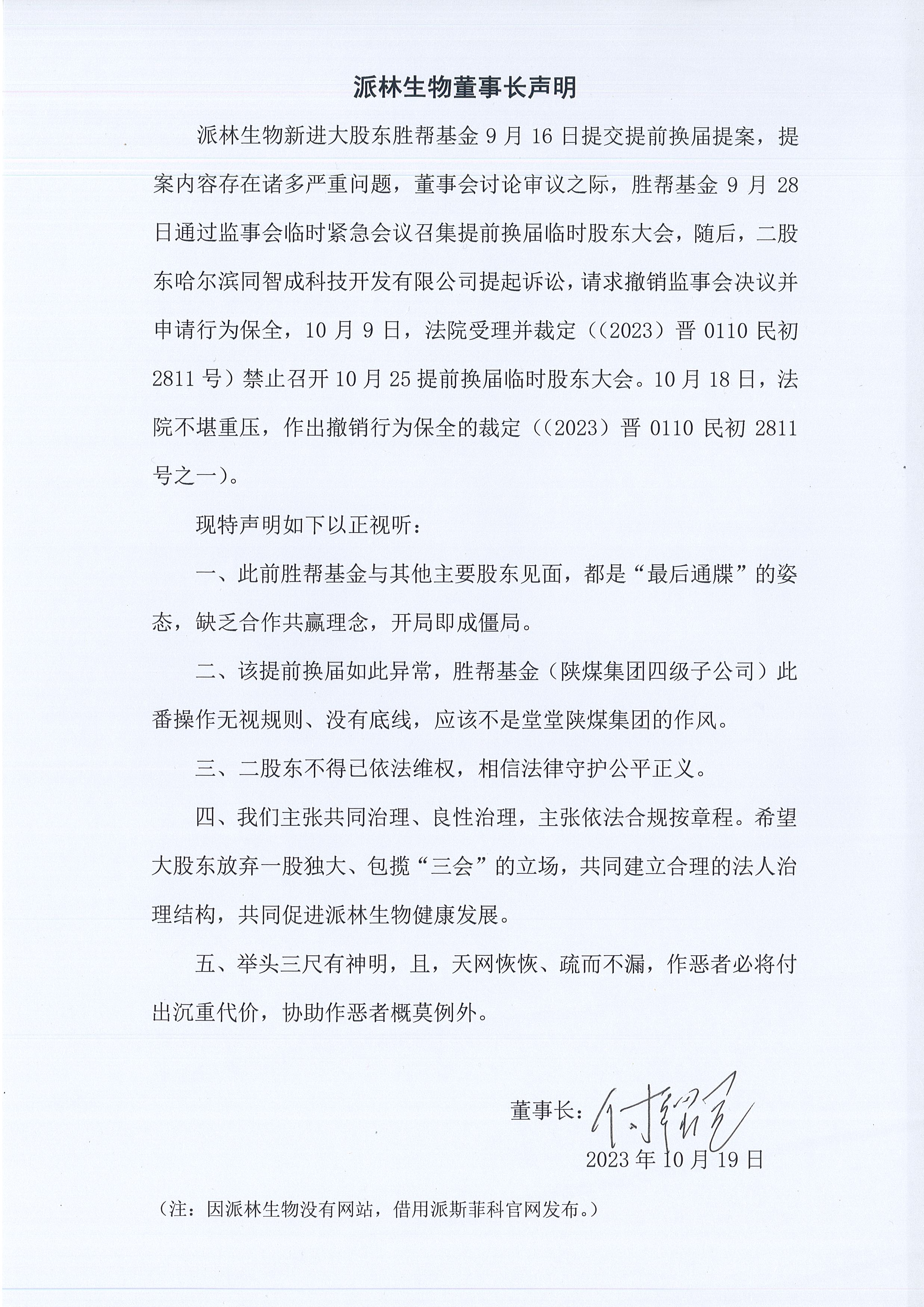 付紹蘭在聲明中表示,一、此前勝幫基金與其他主要股東見面,都是“最后通牒”的姿態(tài),缺乏合作共贏理念,開局即成僵局;二、該提前換屆如此異常,勝幫基金(陜煤集團四級子公司)此番操作無視規(guī)則、沒有底線,應(yīng)該不是堂堂陜煤集團的作風(fēng);三、二股東不得已依法維權(quán),相信法律守護公平正義;四、我們主張共同治理、良性治理,主張依法合規(guī)按章程。希望大股東放棄一股獨大、包攬“三會”的立場,共同建立合理的法人治理結(jié)構(gòu),共同促進派林生物健康發(fā)展;五、舉頭三尺有神明,且,天網(wǎng)恢恢、疏而不漏,作惡者必將付出沉重代價,協(xié)助作惡者概莫例外。