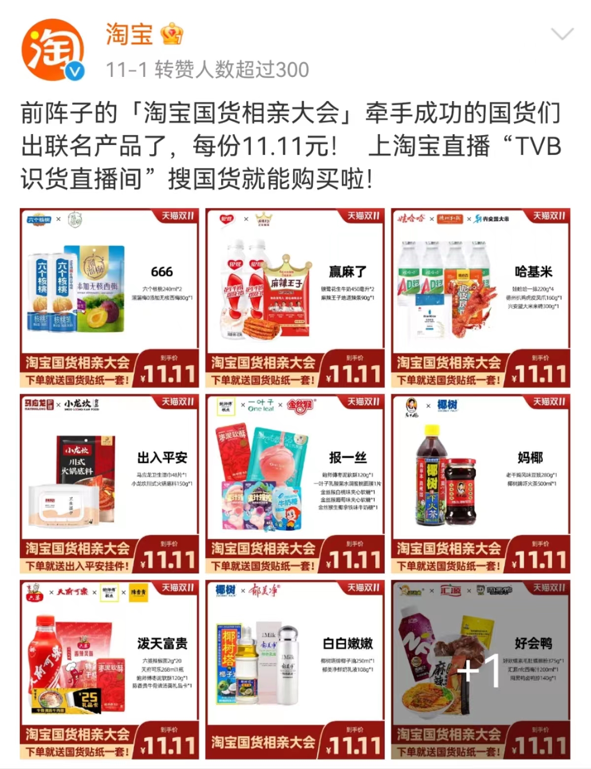 除了企業(yè)的互幫互助,淘寶、京東等多家電商平臺也積極創(chuàng)造國貨“被看見”的機(jī)會。9月份,淘寶上線“國貨超市”,推出好吃、好喝、好看、好用的國貨欄目,戴春林、活力28、黑芝麻、兩面針、蓮花味精等生活百貨均有推薦位;“雙11”期間,淘寶官方還親自下場組織“國貨相親大會”,促成郁美凈和椰樹的“白白嫩嫩”CP等,多家成功“牽手”的品牌還在直播間推出了“雙11”國貨聯(lián)名產(chǎn)品。