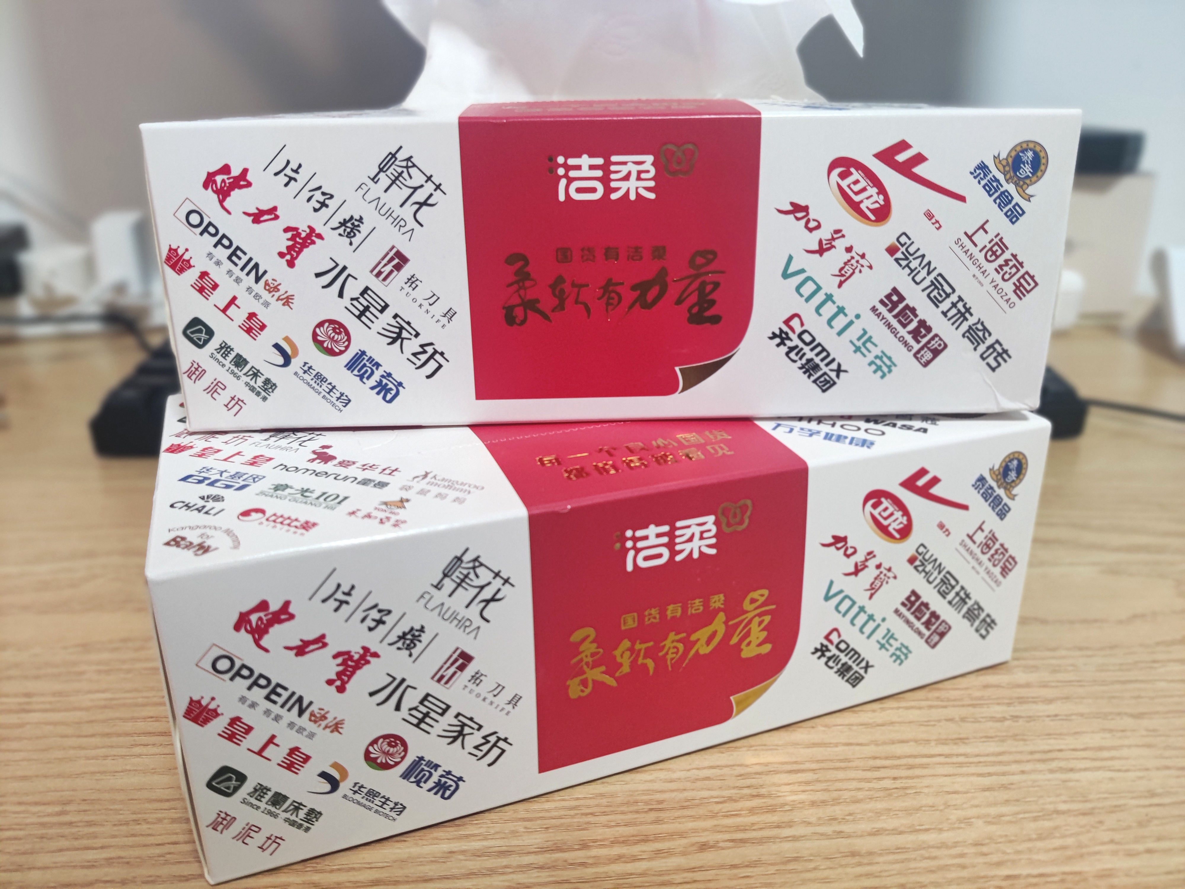 潔柔印有眾多國貨品牌logo的45周年定制版紙巾 劉曉一/攝
