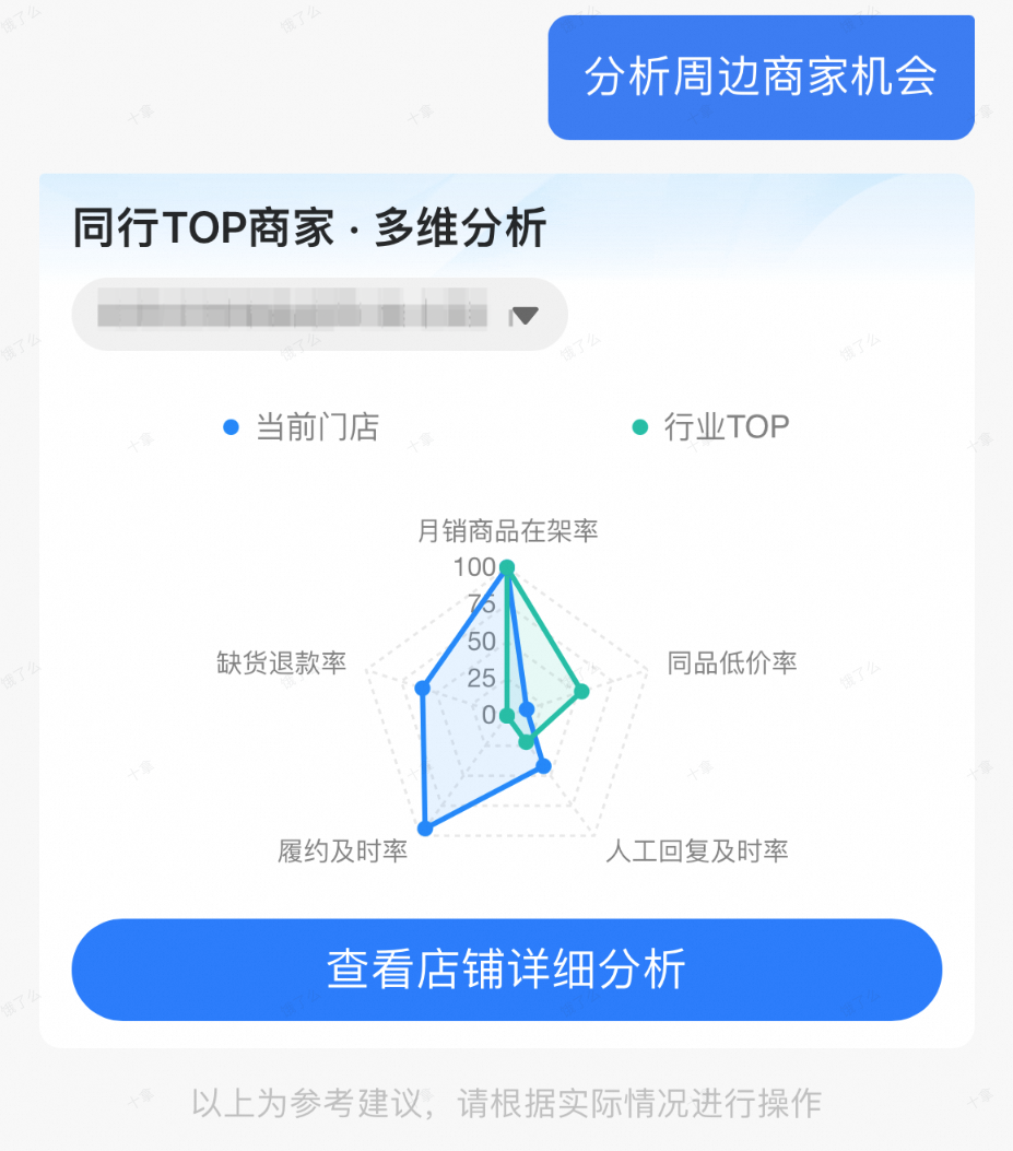 據介紹,通過“AI經營助手”,商家可以根據具體門店查詢對應商圈,找到周邊經營TOP門店,在月銷商品在架率、缺貨退數率、商品低價率、履約及時率、人工回復及時率五個方面進行比對。這些分析可以為門店管理者提供運營優(yōu)化建議和訂單增長的途徑。