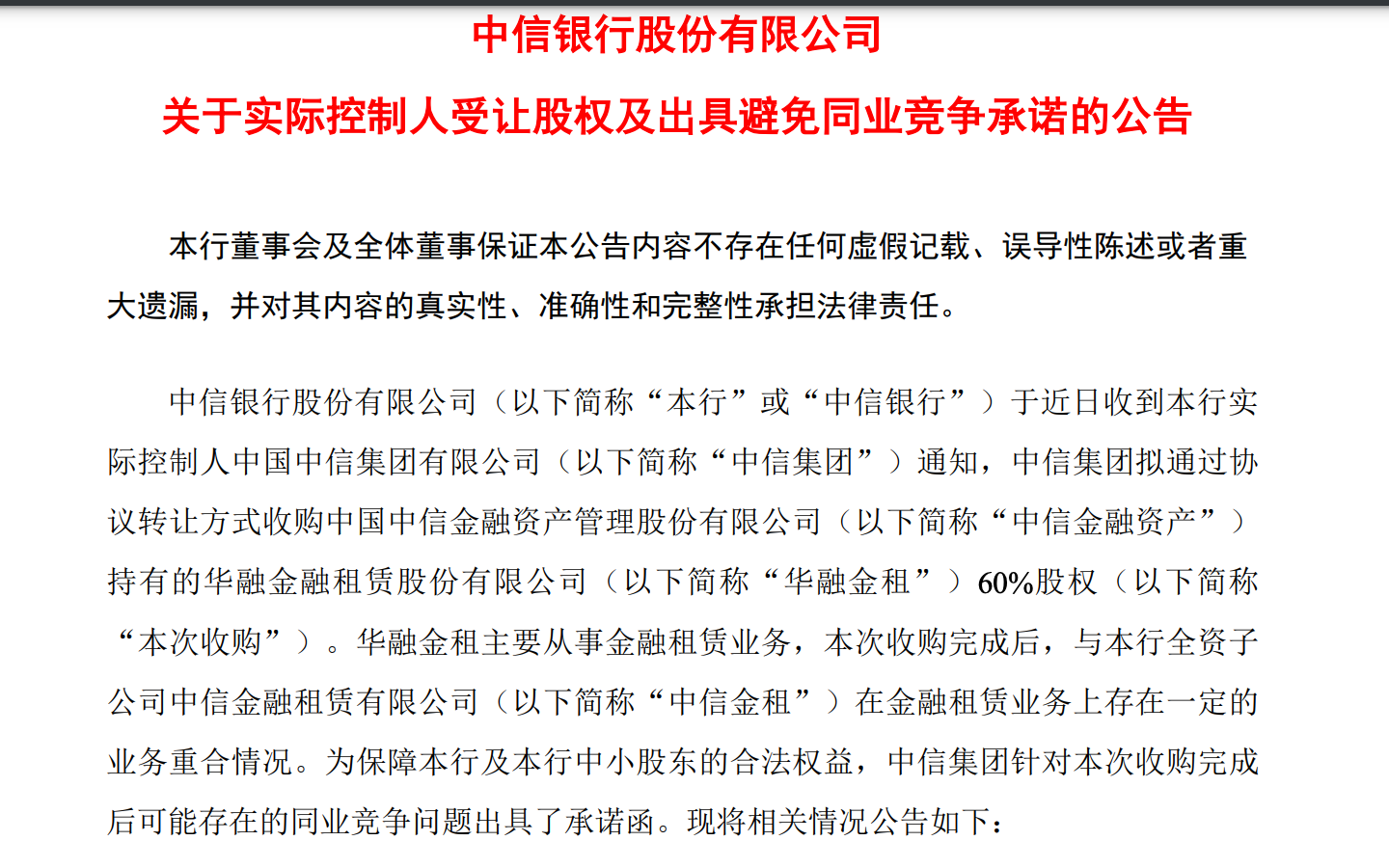 與此同時,中信銀行發(fā)布《關(guān)于實際控制人受讓股權(quán)及出具避免同業(yè)競爭承諾的公告》,此次收購?fù)瓿珊?,與該行全資子公司中信金融租賃有限公司(簡稱“中信金租”)在金融租賃業(yè)務(wù)上存在一定的業(yè)務(wù)重合情況。為保障該行及該行中小股東的合法權(quán)益,中信集團針對本次收購?fù)瓿珊罂赡艽嬖诘耐瑯I(yè)競爭問題出具了承諾函。