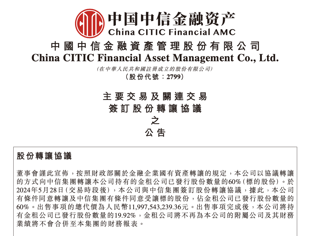 5月28日,中信金融資產(chǎn)發(fā)布公告稱,按照財政部關(guān)于金融企業(yè)國有資產(chǎn)轉(zhuǎn)讓的規(guī)定,以協(xié)議轉(zhuǎn)讓的方式向中信集團轉(zhuǎn)讓該公司持有的金租公司(華融金租)已發(fā)行股份數(shù)量的60%(標的股份),出售事項的總代價為人民幣119.98億元。出售事項完成后,中信金融資產(chǎn)將持有金租公司已發(fā)行股份數(shù)量的19.92%,金租公司將不再為中信金融資產(chǎn)的附屬公司。