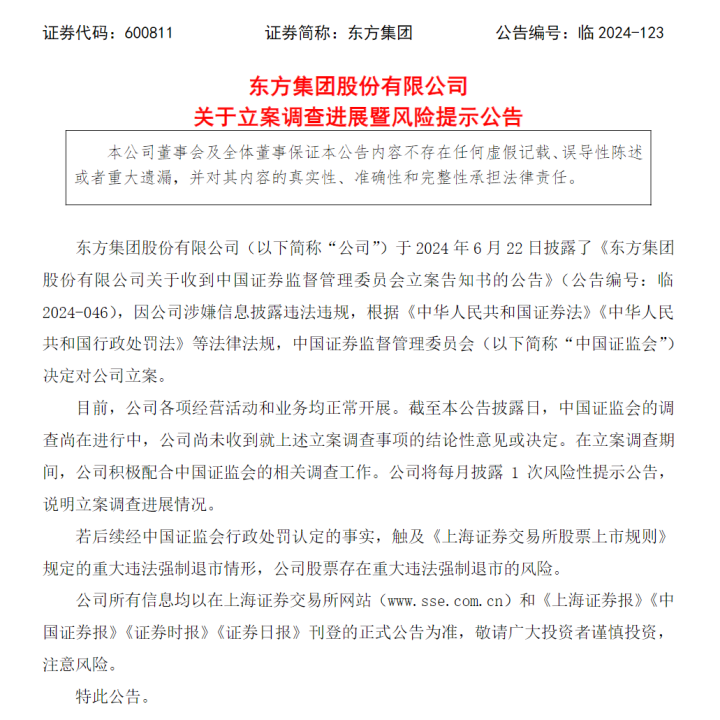 12月3日晚,東方集團(tuán)披露《關(guān)于立案調(diào)查進(jìn)展暨風(fēng)險(xiǎn)提示的公告》稱,再次提示公司可能存在被實(shí)施重大違法強(qiáng)制退市的風(fēng)險(xiǎn)。