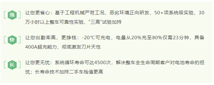 活動(dòng)現(xiàn)場(chǎng),濰柴重磅發(fā)布全系列工程機(jī)械新能源動(dòng)力電池產(chǎn)品,覆蓋裝載機(jī)、挖掘機(jī)、礦卡等市場(chǎng),具有超級(jí)安全、超長(zhǎng)壽命、超高強(qiáng)度、超級(jí)快充等性能優(yōu)勢(shì),為客戶提供多元、低碳、高效的新能源動(dòng)力解決方案,引領(lǐng)行業(yè)新變革。