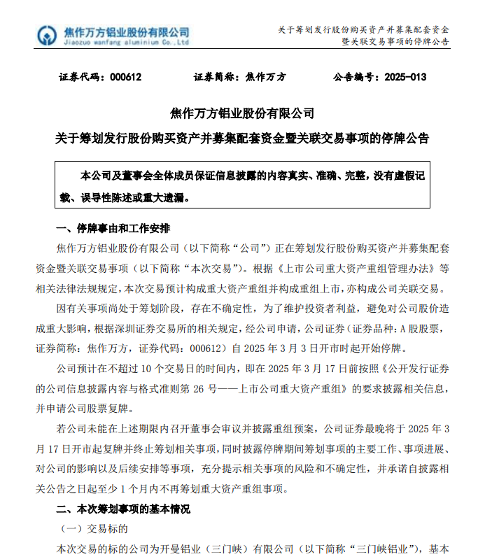 本報(bào)訊 (記者肖艷青)3月3日午間,焦作萬(wàn)方鋁業(yè)股份有限公司(以下簡(jiǎn)稱“焦作萬(wàn)方”)公告稱,公司正在籌劃重大資產(chǎn)重組事項(xiàng),擬以發(fā)行股份購(gòu)買資產(chǎn)的方式,購(gòu)買杭州錦江集團(tuán)有限公司(以下簡(jiǎn)稱“錦江集團(tuán)”)等股東所持有的開(kāi)曼鋁業(yè)(三門(mén)峽)有限公司(以下簡(jiǎn)稱“三門(mén)峽鋁業(yè)”)100%股權(quán)。