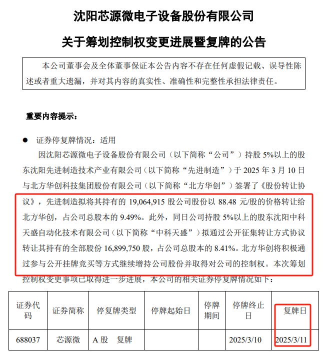 停牌三個交易日后,沈陽芯源微電子設(shè)備股份有限公司(以下簡稱“芯源微”,股票代碼:688037)前期籌劃的控制權(quán)變更在3月10日晚間揭開蓋頭。公告顯示,公司現(xiàn)第二大股東沈陽先進(jìn)制造技術(shù)產(chǎn)業(yè)有限公司(以下簡稱“先進(jìn)制造”)擬將其持有的芯源微全部股份轉(zhuǎn)讓給北方華創(chuàng)科技集團(tuán)股份有限公司(以下簡稱“北方華創(chuàng)”),北方華創(chuàng)未來還將繼續(xù)增持芯源微股份并取得對其控制權(quán)。芯源微股票3月11日開市起復(fù)牌。
