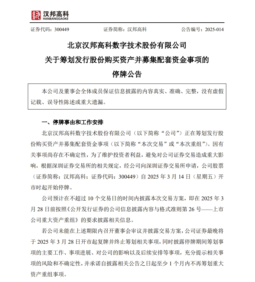 公告顯示,此次交易尚存在不確定性,漢邦高科股票自3月14日起開始停牌,預(yù)計在不超過10個交易日的時間內(nèi)披露本次交易方案,即在2025年3月28日前按照《公開發(fā)行證券的公司信息披露內(nèi)容與格式準(zhǔn)則第26號——上市公司重大資產(chǎn)重組》的要求披露相關(guān)信息。