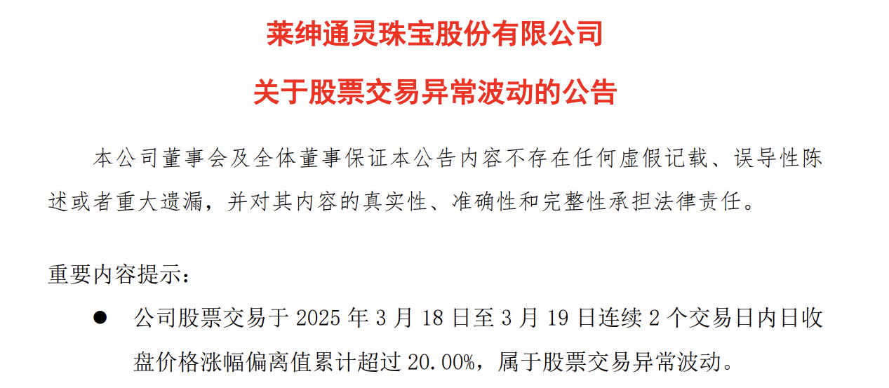 3月19日晚,萊紳通靈發(fā)布公告稱,公司股票交易于3月18日至3月19日連續(xù)2個(gè)交易日內(nèi)日收盤價(jià)格漲幅偏離值累計(jì)超過20.00%,根據(jù)《上海證券交易所股票交易規(guī)則》等有關(guān)規(guī)定,屬于股票交易異常波動。