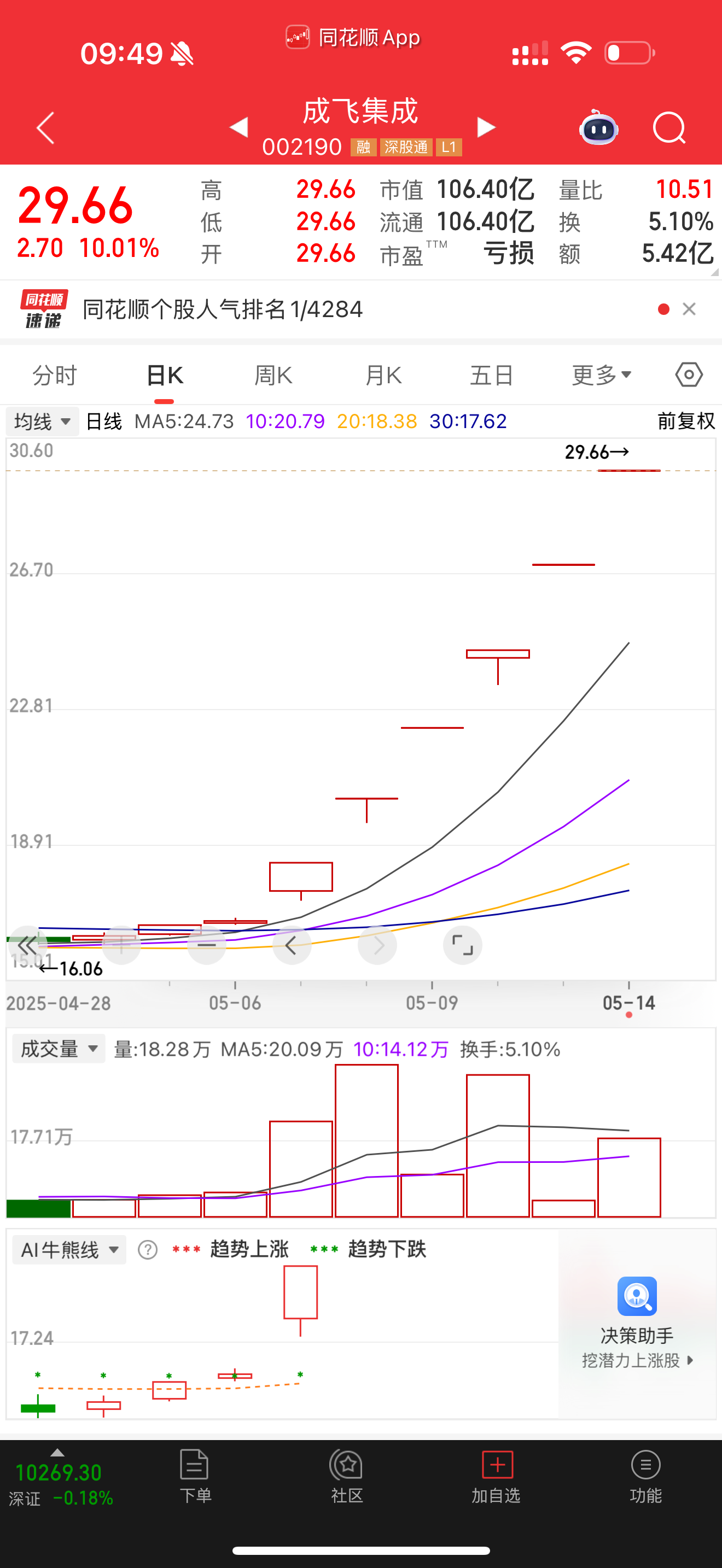 對(duì)于股價(jià)大漲,5月12日,成飛集成發(fā)布的股票交易異常波動(dòng)公告顯示,公司、控股股東和實(shí)際控制人不存在應(yīng)披露而未披露的信息。公司未發(fā)現(xiàn)近期公共傳媒報(bào)道了可能或已經(jīng)對(duì)本公司股票交易價(jià)格產(chǎn)生較大影響的未公開重大信息,經(jīng)營情況及內(nèi)外部經(jīng)營環(huán)境未發(fā)生重大變化。